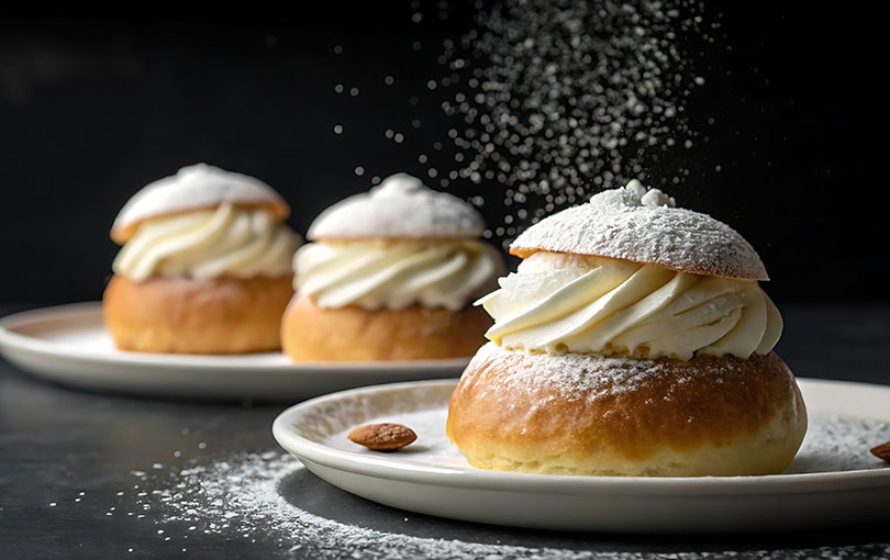 I begynnelsen åts den utan dekoration och utan fyllning och man åt den i djup tallrik med varm mjölk, därav namnet HETVÄGG. Så ska vi också äta den i dag, men vi äter den naturligtvis stuffad med nyttigheter som grädde och mandelmassa och Eva anser att just deras semla är läckrast i Sverige!